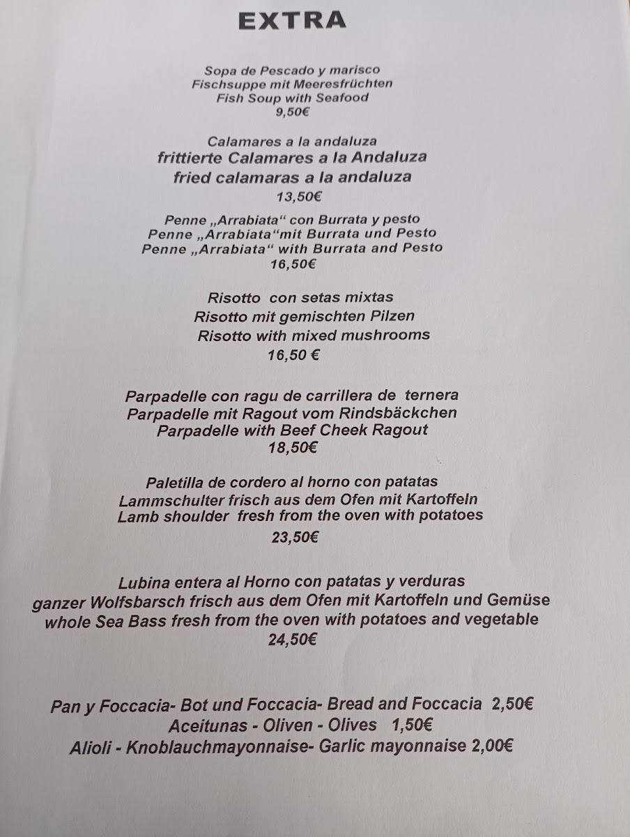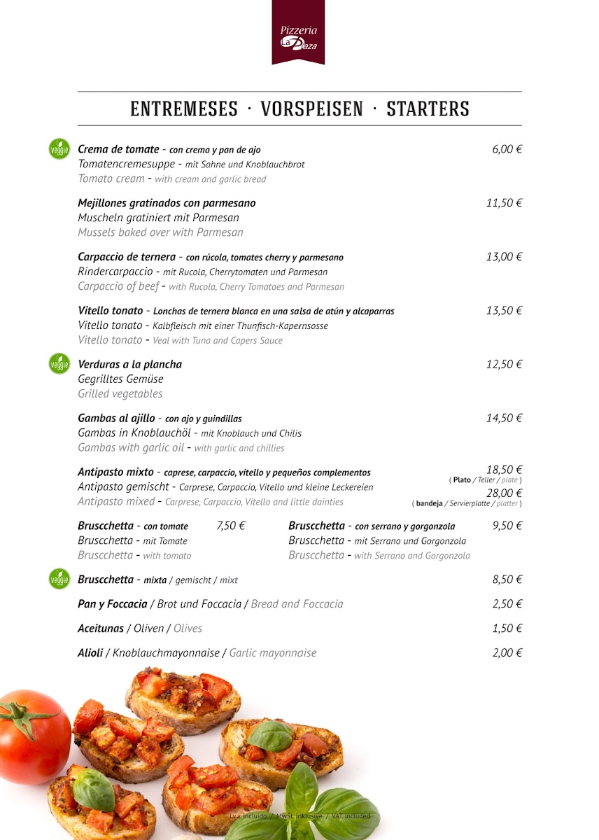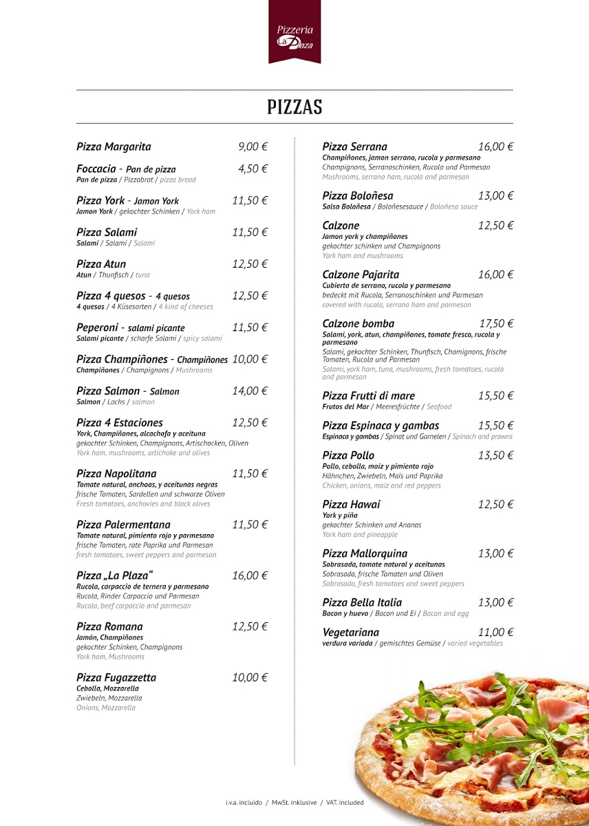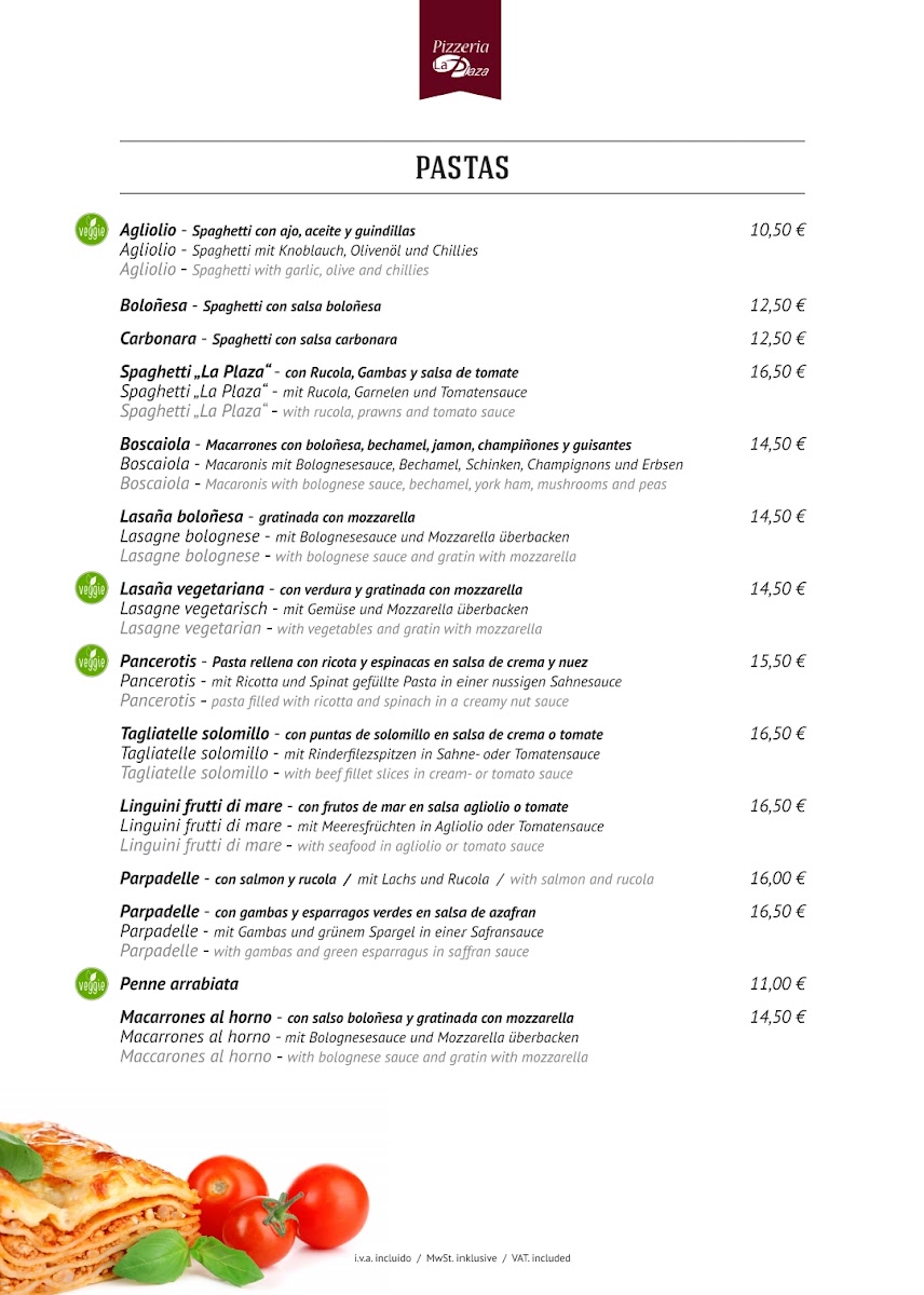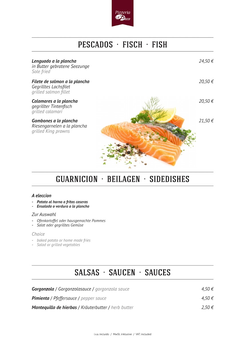 The menu at Restaurante La Plaza reflects a confident balance between hearty comfort food and carefully prepared Mediterranean-inspired dishes, making it well suited for diners who appreciate variety without losing focus. Premium cuts like Rib Eye and Meat for Stone highlight the restaurant’s strength in grilled meats, delivering robust flavors and a satisfying sense of indulgence. Seafood lovers are equally well served with plates such as Fischplatte and Lazac, which bring freshness and clean execution to the table. Traditional slow-cooked depth appears in Carrilladas, offering rich texture and warmth, while vegetarian options such as Lasagne Vegetarisch, Parmigiana de Berenjena, and Rissotto de Funghi ensure the menu remains inclusive and thoughtfully rounded. The pizza selection, including Pizza 4 Saisons and Pizza Quattro Formaggio, stands out for its classic combinations and crowd-pleasing appeal, complemented nicely by lighter starters like Focaccia Y Mahonesa. More distinctive items such as Kagyló Csőben Sütve Parmezánnal add personality and international flair to the menu, while a simple Coffee rounds off the dining experience comfortably. Overall, the menu feels cohesive and well-curated, offering dependable quality across meats, seafood, vegetarian dishes, and pizzas without unnecessary excess.